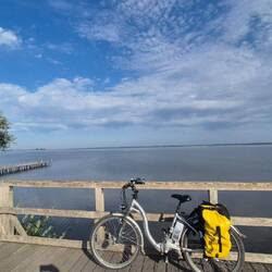 Nach so vielen, schönen Momenten, tia, was soll ich sagen. Ich komme zu meinem Fahrrad, Platten. Naja, wenigstens nicht in der "Butnik". Wer kennt den Ausdruck?😏Gegenüber war eine Tankstelle, also erstmal aufgepumpt, klappte nicht gleich beim 1. Mal, und dann weiter zum ortsansässigen Fahrradladen. Der Mitarbeiter zögerte erst ein wenig, hmh, Pedelec, Gott sei Dank, Vorderrad. In 1 Stunde fertig. Also ab an die Promenade, vorher noch Bücherschrank geplündert, Bar mit Blick auf's "Meer ", Weinschorle bestellt, Ansichtskarte geschrieben, bei schöner Loungemusik Menschen beobachtet. 😏