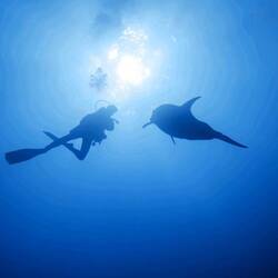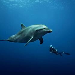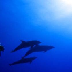 PS: einen Fakt über Delfine kann ich hier wohl nicht unterschlagen… sie sind super verspielt und neugierig und genießen die Streicheleinheiten. Es kann aber auch passieren, dass die Männchen hierdurch sichtlich erregt werden und dann nicht mehr von den Tauchern ablassen. Außerdem können sie auch aufdringlich werden, wenn ihnen nach spielen zu Mute ist und dem Taucher nicht. Mein Tauchguide wurde in der Vergangenheit mal von einem jungen Männchen mitten im Pass auf den Boden gedrückt. Das ist zwar beides nicht die Regel, aber eben auch keine Seltenheit!
