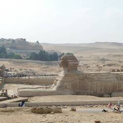 The Great Sphinx of Giza is from the reign of King Khafre (2575–2465 BCE) and depicts his face. It is 73 metres long and 20 metres high. It features a lion’s body and a human head adorned with a royal headdress. The statue was carved from a single piece of limestone, and the entire Great Sphinx was originally painted. It would have taken about three years for 100 workers, using stone hammers and copper chisels, to finish the statue.Læs mere