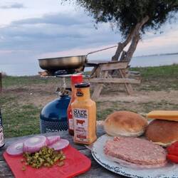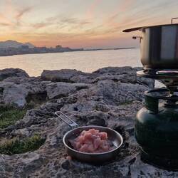 Die Tage verbringe ich mit Sport, ein wenig Basteln (z. B. das am Strand gefundene Messer aufarbeiten) und vorallem Relaxen. Abends machen wir ein Feuer und Kochen zusammen.