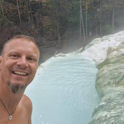 Wieder eines der schönen gratis Schwefelbecken. 37° warm. Glasklar und nebenan ein kleiner Wasserfall (in kalt) für Wechselbäder. Nicht viel los hier aber umso gemütlicher.