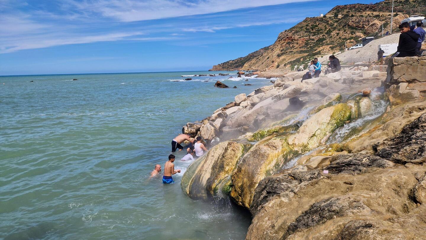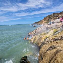 Sehr heiß sogar. Im oberen schön angelegten Zulauf überhaupt nicht nutzbar. Kochend heiß. Tut richtig weh. Also runter ins Meer. Da kommt es leider immer noch viel zu heiß an.