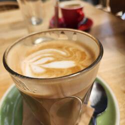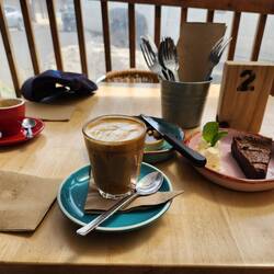 Got a coffee from KI Roasters coffee van. I got talking to a woman who I found out was staying in the apartment below us - Appt 2 of Sunrise on Falie.