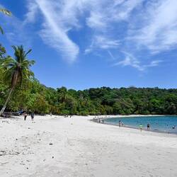 Wir betreten Neuland in Costa Rica: Quepos, ein nahegelegenes Städtchen beim Manuel Antonio Nationalpark - DEM berühmtesten Park in Costa Rica überhaupt. Und so stellten wir uns schon auf relativ viel Menschen ein, aber natürlich auch auf schöne Natur und viele Tiere. Dass man diese Tiere auch sieht, soll sich ein Guide mit Fernglas lohnen, durch das man auch Fotos machen kann. Gesagt getan, und wir stehen nach einer halbstündigen Busfahrt kurz nach 7 Uhr morgens auf der Matte. Bis sich alle Teilnehmer:innen eingefunden hatten verging einen Moment, aber die Antwort auf alles ist hier 'Pura Vida'. 😉 Drinnen dann der Schock: der Hauptweg besteht aus einer breiten Schotterstrasse, umgeben von sehr alten und hohen Bäumen. Wir drücken uns also praktisch 2 Stunden zwischen hunderten von Menschen hindurch, wobei wir hin und wieder Schlange stehen um in das Fernglas zu schauen, wodruch die Tiere natürlich extrem nah scheinen. Das ist auch für uns neu und wir sehen ein eher seltenes Stachelschwein schlafend auf dem Baum, einen Nasenbär (Coati), ein paar Faultiere, den Jesus Christ-Lizard (eine Echse die so heisst weil sie quasi über das Wasser rennen kenn 🤓), eine schlafende Fledermaus und ein paar coole kleine Insekten. Aber halt alles kaum von blossem Auge erkennbar. Und wenn sich dann 200 Menschen unter einen Baum quetschen um ein in 30 Meter Höhe schlafendes Faultier zu sichten müssen wir uns ein bisschen zusammenreissen (aber ja klar, wir sind auch von der Karibikküste verwöhnt worden, wo wir ganz alleine und ganz nahe bei den Faultieren auf dem Kajak sein durften 😁). Nach der Tour waren wir so k.o. dass wir kurz am Strand entspannten, welcher wiederrum nicht so überfüllt war wie erwartet und ganz schön. Die einzelnen One-way-Pfade haben wir dann nicht mehr gemacht, die Hitze war unerträglich. Ein paar Mal trafen wir noch auf die ziemlich cleveren, aber frechen Kapuzineraffen, die ganz ohne Scheu in den Bäumen hingen und über unsere Köpfe sprangen.😍