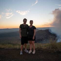 Das Highlight unserer Tage hier werden aber weder die feinen Mahlzeiten noch die schönen farbigen Gassen: Am späten Nachmittag ging es ab auf eine Sonnenuntergangs-Vulkantour. Nach vielen Infos zu Granada und Nicaragua durch unseren privaten Guide kamen wir im Masaya Nationalpark und schliesslich beim aktiven Nindiri-Vulkan an. Es ist wohl der am einfachsten zu erreichende aktive Vulkan der Welt - man kann tatsächlich bis an den Kraterrand fahren.😂 Vom Aussichtspunkt direkt neben dem Parkplatz erhaschten wir einen ersten Blick in den aktiven Krater! Kontinuierlich steigen schwefelhaltige Gase aus der Magma auf - ein ganz spezielles Gefühl hier zu stehen!🤩
