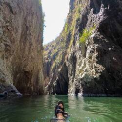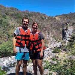 Der erste Tag startet dann schon um 5 Uhr früh: Da die Firma recht jung ist und sich auch nicht alle Touristen so hoch in den Norden verirren, kommen wir einmal mehr in den Genuss einer Privattour zum Somoto Canyon. Die Landschaft unterwegs ist geprägt von Hügeln, Bäumen, Feldern und kleinen Dörfern, jedoch durch die jetzige Trockenzeit alles eher dürr. Die Fahrt endet nahe der Grenze zu Honduras und bringt uns zu unserem heutigen Tourguide. Bevor wir ins kühle Nass springen dürfen geht es über einen schmalen Weg zu Fuss zum Somoto Canyon, vorbei am Wohnhaus des Guides. Schon zu Beginn sichten wir die hohen Steilwände und das klare Wasser in den Flussbecken. Ein bisschen mehr Action wäre wahrscheinlich schon vorhanden wenn der Fluss mehr Wasser führt, doch auch so können wir schwimmen, uns treiben lassen, auf den glitschigen Steinen balancieren und gewagte Sprünge vollziehen.😎 Der letzte hat es dann in sich: nach einer kurzen aber knackigen Kletterpartie wagen wir den Sprung vom Felsen 16 Meter hinunter in das tiefe Becken. Während Chantal keine Zweifel zulässt und sich mit einem Schrei in die Tiefe stürzt, der dem eines Adlers in nichts nachsteht, überlegt Thomas eine Sekunde zu lang. Aber auch er kann sich schliesslich nicht dem motivierenden Druck der Gruppe entziehen und schreitet elegant zur Tat. Voller Adrenalin bejubeln wir uns gegenseitig.🤩