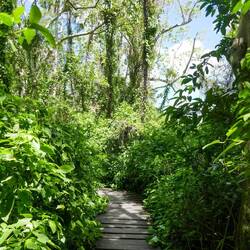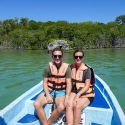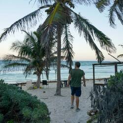 Die zweite Nacht verbrachten wir an der Lagunr Bacalar - und da wir uns in der "heiligen Woche" vor Ostern befinden, wahrscheinlich die höchsten Feiertage in gefühlt ganz Mittelamerika, leider nicht ganz alleine. Der "Campingplatz" liegt direkt neben dem öffentlichen Parkplatz und Zugang zur Lagune, aber zum Glück sind nach Sonnenuntergang keine Menschen mehr da, und so können wir nach einer ruhigen Nacht einen Schwumm bei Sonnenaufgang in der glasklaren Lagune mit Wassertemperatur 30° unternehmen. Traumhaft! Da uns aber der Besitzer schon gewarnt hat, dass er am Karsamstag einen riesigen Ansturm erwartet, machen wir uns dementsprechend früh wieder auf die Räder. Wir wollen heute dem hochgelobten Naturpark Sian Ka'an einen Besuch abstatten. Relativ spontan buchen wir noch eine Bootstour dazu. Der Weg zur Laguna de Muyil führt uns durch einige Ruinen der Mayas, zu einem Aussichtsturm der zwar Treppenstufen hatte, aber der Steilheit nach eher eine Leiter (Kategorie: üüüberhängend) darstellte und über einen etwas in die Jahre gekommenen Steg durch den Wald. Die Farben der Lagune: alle möglichen Blautöne, die man sich nur vorstellen kann! 😍 Im kleinen Boot flitzen wir übers Wasser zu einem kleinen Verbindungskanal mit der nächsten Lagune. Auf Empfehlung des Guides ziehen wir unsere Schwimmwesten im "Windel-Style" an und lassen uns so gemütlich sitzend durch das durchsichtig türkise Wasser entlang der Mangroven treiben. Ein absolutes Highlight! 🥹 (Auch wenn Chantal ausnahmsweise mal nicht von Mücken, dafür von einem Krebs attakiert wurde...🦀). Als wir dann auch noch erfahren, dass es in Sian Ka'an die Möglichkeit gibt Seekühe in den Lagunen zu beobachten, ist uns sofort klar, wo wir am nächsten Tag hinwollen. Zur Bootsablegestelle müssen wir allerdings einmal durch Tulums Zentrum hindurch, dann durch die Hotelleriezone von Tulum (ein Hotel an das nächste gepflanzt, dicht gedrängt am Strand, voller Boutiquen und chiquen Restaurants). Wir ahnen es: kein Meter wurde hier freigelassen, um kurz stehenzubleiben und einen Schwumm im Meer zu nehmen. Die vielen Autos, Menschen, Fahrräder und Gebäude überfordern uns gelinde gesagt ein bisschen. Der Camping, aka ein kleiner Parkplatz eines Zeltplatzes inmitten (!) Der Hotelzone, entpuppt sich als Katastrophe für den wir noch 70.- für eine Nacht bezahlen sollen! 😂 Nein Danke. Im Park selbst fand sich dann in der Abenddämmerung noch ein kleiner Camping, der zwar auch nicht gerade günstig und weder sauber noch intakt war, dafür ruhig, direkt am Meer und mit Hundewelpen. Ja gerne. 🐶
