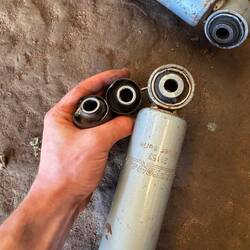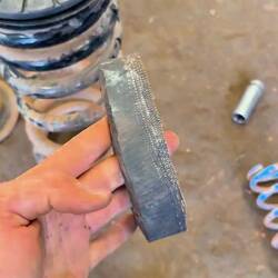 An der Hinterachse war es dann nochmal richtig lustig, wir wollen das Auto hinten höher legen, da wir dich das extreme Gewicht hinten zu tief hängen. Meine Idee war also ein 3cm dickes Drehteil oder Ähnliches anfertigen zu lassen, welches wir unter der Feder unterlegen. Naja man muss nehmen was man kriegt, der Chef kennt keinen in der Stadt der drehen kann also bestellt er jemanden her der das gewünschte Teil aus Gummi „fertigt“. Eine Stunde später ist das Teil da, ein dickes Stück aus einem alten Trecker oder LKW Reifen auf unser Maß geschnitzt.
