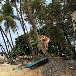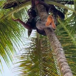 Am nächsten Tag geht es morgens auf einen kleinen Boots Trip mit einem Local. Wir fahren zu einer kleinen Insel und angeln etwas mit der „Angel“ insgesamt fangen wir sechs kleine Fische. Danach gibt es frische Kokosnuss die uns einer der Jungs extra kurz vorher von der Palme Pflückt. Beeindruckend die Technik um die Palme hoch und runter zu kommen.