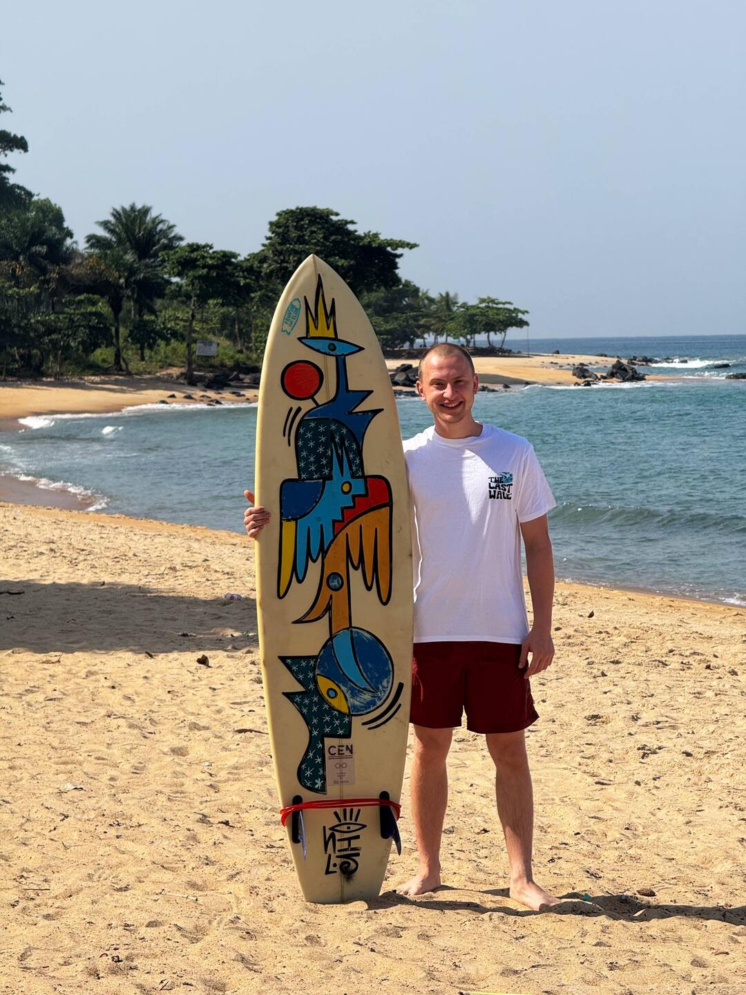 Wir nennen es Möchtegern USA, das meinen wir überhaupt nicht abwertend. Es ist einfach nur so dass, neben den ganzen Sachen die der USA ähneln immer noch dieser Afrika vibe herrscht. Hütten aus Holz und Wellblech zeichnen die Landschaft. Die Hauptstraße durchs Land ist asphaltiert, immer wieder gibt es aber einen Schotter Abschnitt. Abseits der Hauptstraße gibt es nur Schotter oder die typischen Roten Stein/Sand Pisten. Nach der Grenze geht es für uns nach Robertsport. Uns überrascht ein Traumhafter Strand. Wir lernen Henning kennen, ein Deutscher der mit seinem ausgebauten VW T6 in Richtung Namibia unterwegs ist. Ein einheimischer Surfer bietet uns an für uns zu kochen. Für 20 US Dollar bereitet er uns auf dem Feuer vor unseren Augen Fisch mit Reis und Zwiebelsoße für 5 Personen zu. Für mich quasi das nachfeiern meines gestrigen Geburtstags.