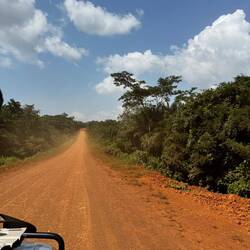 Wir fahren weiter und wieder in den Wald hinein, immer wieder sehen wir Frauen und Kinder die sich und ihre Klamotten am Fluss waschen. Viele tragen auch einen 20L Kanister Wasser vom Fluss ins Dorf, meistens auf dem Kopf.