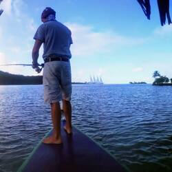 Als wir mit dem Kajak zum schnorcheln unterwegs sind, fährt William mit seinem Boot an uns vorbei. In einem seiner Häuser schlafen wir die ganze Zeit. Er hat uns direkt zum Mittagessen eingeladen. Also Kajak ans Boot gehängt und los geht's. Full speed! So schnell waren wir noch nie mit dem Kajak unterwegs. 😂 Es gab lecker gegrillten Thunfisch mit Brotfrucht, Senfsoße und dazu Rum mit Mangosaft und Wein. 😄 Es war sehr interessant und witzig.