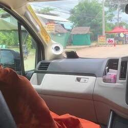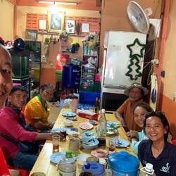ដោយសារតែតៃកុងឡានដែលត្រូវមកទទួលពួកយើងពីច្រកអូរស្មាច់/ឆងចម មិនបានបង្ហាញខ្លួនដូចដែលបានសន្យាថានឹងជួបនៅម៉ោង១០ព្រឹក និងមិនលើកទូរស័ព្ទទាល់តែសោះ យើងត្រូវចំនាយពេលរង់ចាំ 2 ម៉ោង។ យើងមិនហ៊ានទៅជិះឡានតាក់ស៊ីផ្សេងទៀត ព្រោះខ្លាចគាត់មកជ្រួសគ្នា។ នៅទីបញ្ចប់ យើងបានសម្រេចចិត្តទៅជាមួយតាក់ស៊ីក្នុងស្រុកទៅកាន់សុរិន្ទ បន្ទាប់មកទើបស្វែងរកមធ្យោបាយធ្វើដំណើរផ្សេងទៀតទៅកាន់គោលដៅចុងក្រោយរបស់យើង។ ពេលយើងទៅដល់ចំណតឡានក្រុងសុរិន្ទ គាត់នៅទីនោះប្រាប់យើងថាគាត់គេងជ្រុលម៉ោង។ គាត់ជាមិត្តភក្តិរបស់សមាជិកធ្វើដំណើរម្នាក់ ដូច្នេះយើងមានតែព្រមទៅជាមួយគាត់ដដែល។ ដល់ពេលយើងទៅដល់ខេត្តឧប៊ុន ហើយចូលទៅក្នុងភូមិ វាយប់បាត់ទៅណាស់ ហើយគ្មានភោជនីយដ្ឋានសម្រាប់ណានៅបើកទេ។ យើងបានឈប់នៅហាងចាប់ហួយមួយដែលមានលក់មីកញ្ចប់ និងអាហារសម្រន់ផ្សេងទៀត ប៉ុន្តែសំណាងល្អបន្ទាប់ពីគាត់និយាយជាមួយម្ចាស់ហាងរួច ពួកគេបានទូរស័ព្ទទៅភោជនីយដ្ឋានមួយក្បែរនោះជួយសុំឲ្យគេនៅបើកបន្តចាំយើងទៅហូប។ ម្ចាស់ហាងទាំងប្តីប្រពន្ធគួរឱ្យស្រឡាញ់ណាស់ ពួកយើងបានសន្ទនាគ្នាបន្តិច ហើយបានស្តាប់រឿងថាមានប្រជាជនថៃមួយចំនួនសុខចិត្តផ្លាស់ទៅរស់នៅទីជនបទវិញបន្ទាប់ពីរៀនចប់មហាវិទ្យាល័យនៅក្រុងបាងកក ហើយចាប់ផ្តើមបង្កើតអាជីវកម្មផ្ទាល់ខ្លួននៅទីនេះ ដោយរស់នៅតាមជីវភាពកាន់តែសាមញ្ញ និងរីករាយជាងមុន។ ពួកគេមិនត្រឹមតែបម្រើអាហារឆ្ងាញ់ៗដល់យើងប៉ុណ្ណោះទេ ថែមទាំងបានច្រៀង និងដេញហ្គីតាឲ្យយើងស្តាប់កម្សាន្តផងដែរ។ បងប្រុសចុងភៅចូលចិត្តលេងហ្គីតា ប៉ុន្តែប្រពន្ធរបស់គាត់មិនចូលចិត្តសំលេងរំខានដែលគាត់ច្រៀងឡើយ 😀 ដូច្នេះការលេងសម្រាប់ពួកយើងក៏ជាការរីករាយសម្រាប់គាត់ផងដែរ។ ពួកគាត់ទាំងបានឱ្យស្វាយយក្សទម្ងន់ ១,២ គីឡូក្រាមមកយើងទៀតផង។ ពួកយើងគ្មាននរណាម្នាក់អាចស្មានទម្ងន់ផ្លែស្វាយនោះត្រូវទេ! បទពិសោធន៍នៃការទទួលទានអាហារនេះគឺជាចំណុចពិសេសសម្រាប់ខ្ញុំក្នុងការធ្វើដំណើរដ៏វែងឆ្ងាយពេញមួយថ្ងៃហូតមកដល់ត្រឹមនេះ។