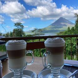 Hostel mit coolen Hängematten und Gemeinschaftsküche. Zum Frühstück gab es Gallo Pinto, ein traditionelles Gericht hier in Costa Rica und Zentralamerika. Eigentlich recht einfach, aber lecker… Reis mit Bohnen, Rührei, Toast und Kochbananen. Generell ist es hier in Costa Rica super teuer und schlägt teilweise die Preise in der Schweiz! Daher waren wir froh über unser gratis Frühstück und haben uns hier von Nudeln, Reis und Früchten ernährt…😂 Zu Timons Enttäuschung kostet eine Tüte Chips oder Käse leider mindestens 6€ oder einfache Müsliriegel 8€ 🥲😂. Einen Latte Macchiato haben wir uns trotzdem mit Blick auf den Vulkansee gegönnt 🤑😇. Von La Fortuna ging es anschließend mit dem Jeep-Boot-Jeep-Shuttle über den Vulkansee nach Monteverde in die Wolkenwäldern ☁️🌲!Baca selengkapnya