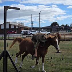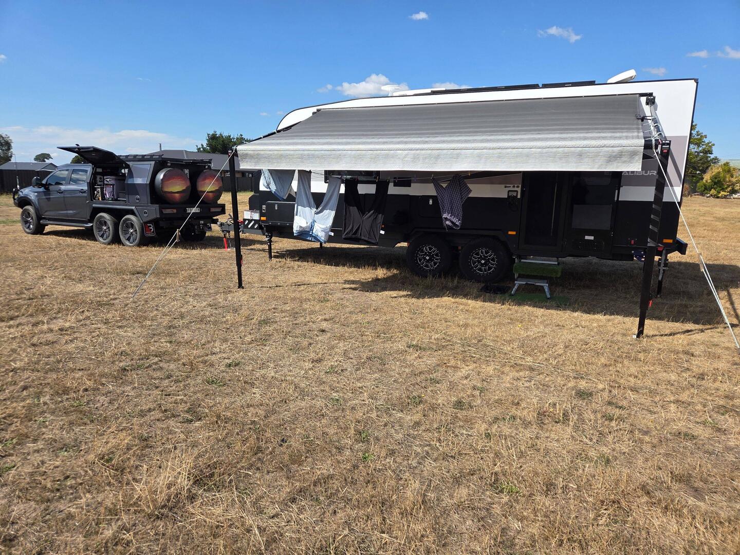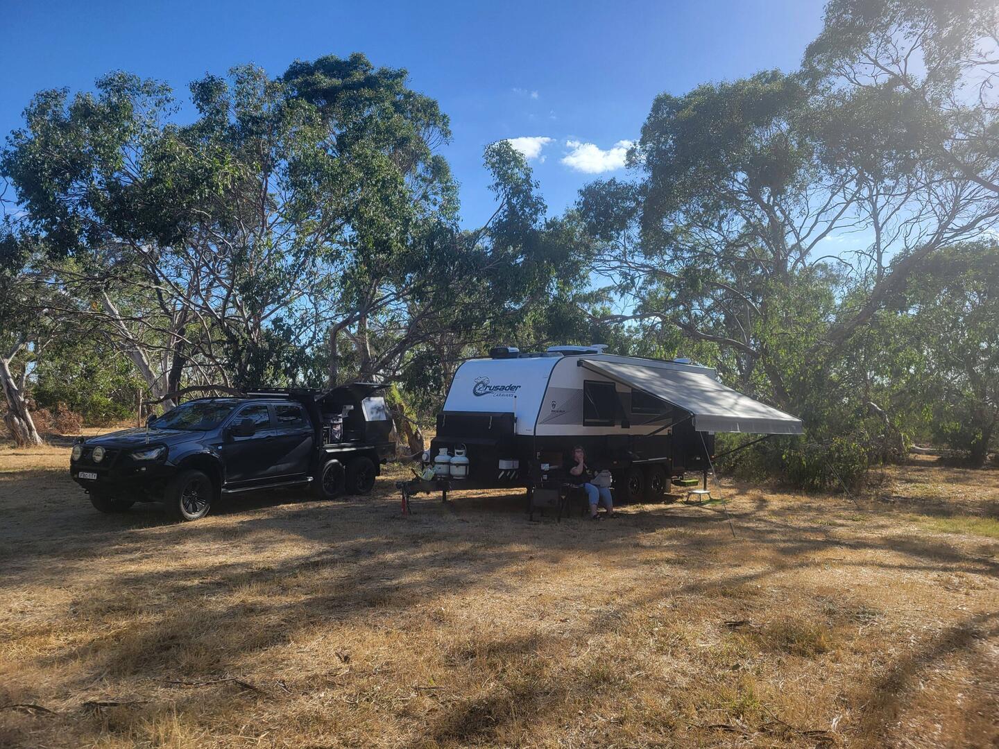 Mac's farm $20/n. Left Westbury after filling water. Lots of hills and narrow suburban streets before we found Mac's Place. Setup and went for a drive, to Bunnings to get a flexible pale. Then toLæs mere