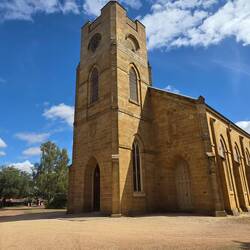 Free camp. Drove to Launceston via a country road. Checked out an old Anglican church and cemetery at Hagley, then onto Carrick to look at some old buildings. Lunch at a park on the river at Hadspen.Læs mere