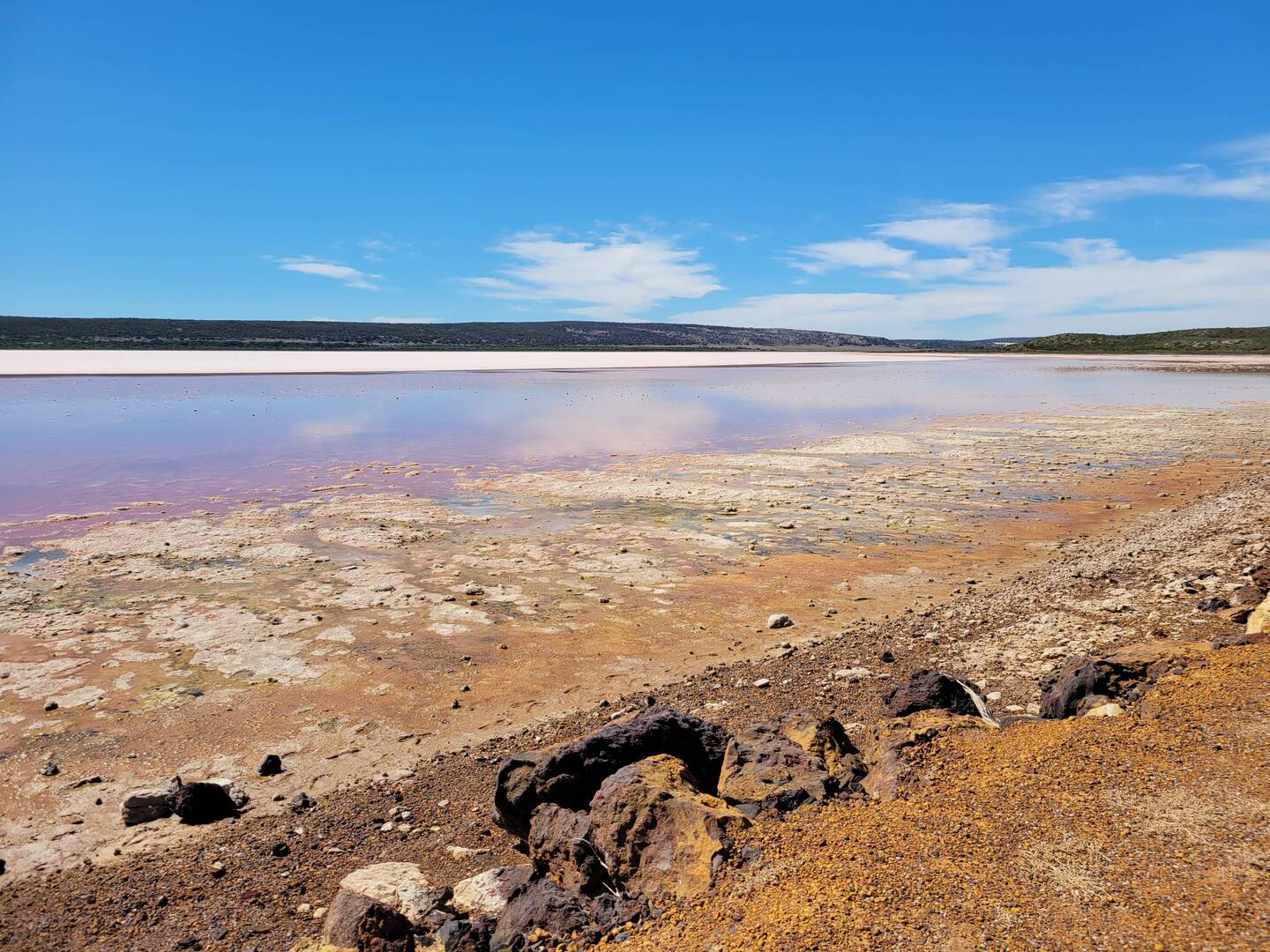 Easy drive to Baandee lake. Lake changes colour through day, blue, green, brown, yellow. Very hot on arrival then winds then rain.