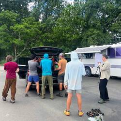 Den sti/vej, vi skulle være gået af, da vi skulle gå fra Te Kūiti, fulgte bl.a. en flod. Men eftersom det havde regnet en del, var den gået over sine bredder, og vores søde Trail-host kørte os i stedet hen til starten af Timber Trail, 40 minutters køretid. Vi kæmpede lidt med at få plads til vores tasker i bilen, men det lykkedes!