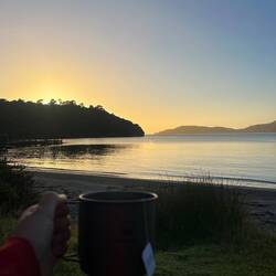 Om morgenen vågnede jeg op til en flot solopgang og nød min langsomme morgen med varm kakao. Derefter gik jeg videre til det næste campsted, hvor der desværre ikke var nogen udsigt, da det var midt i skoven.