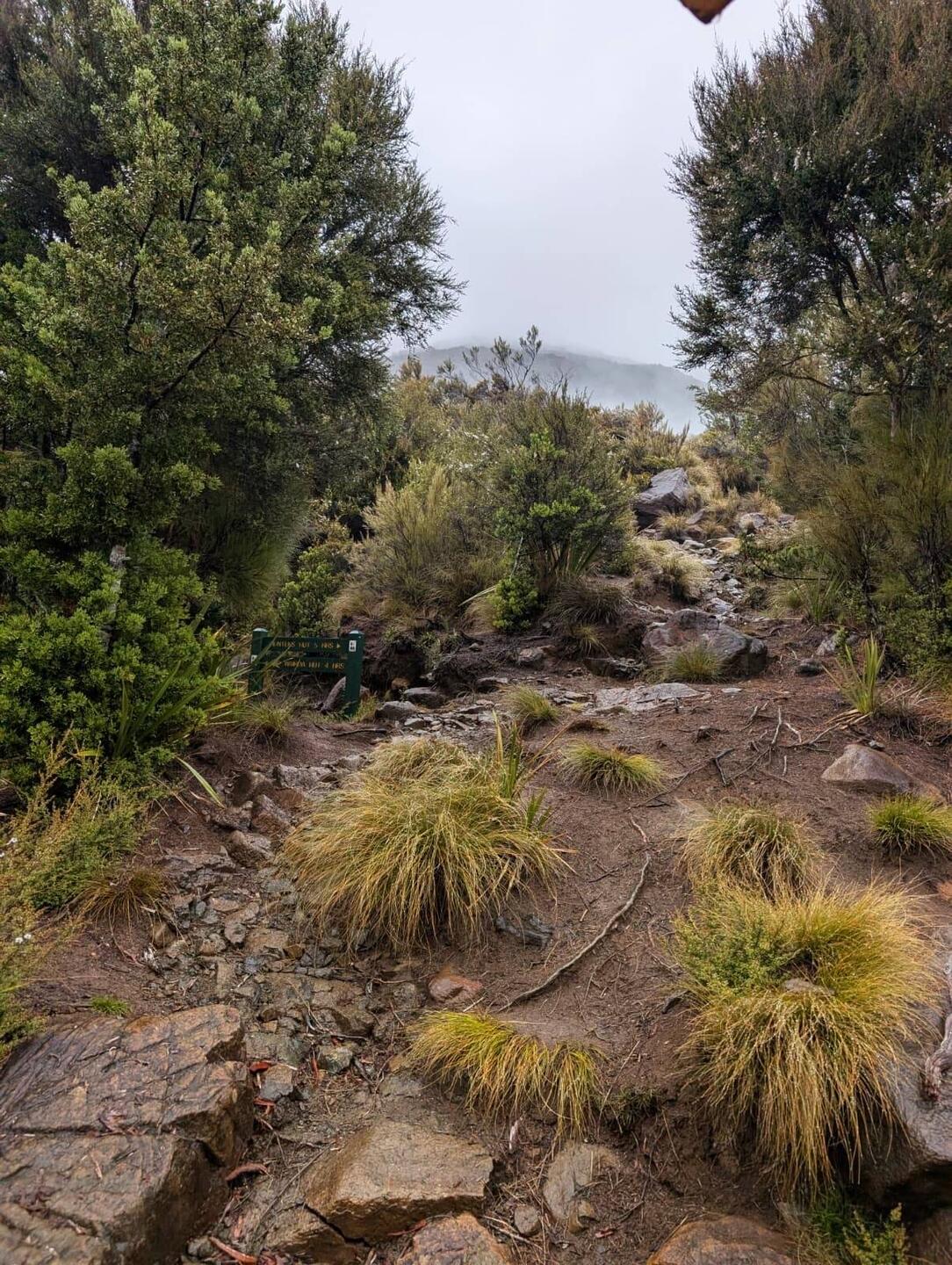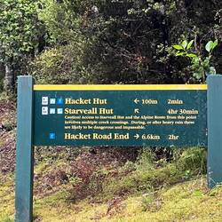 Da der næsten ikke var nogen biler på vejene om morgenen, delte vi en taxa med to andre til Hacket-parkeringspladsen, da det ellers næsten ville have taget os det meste af dagen at komme tilbage til stedet, hvor vi forlod stien den 23. december. Herfra gik vi mod Hacket Hut, hvor vi holdt pause, inden det gik 1.000 højdemeter op mod Starveall Hut.