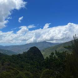 Vi startede med at gå op over trætoppene, hvorefter den første store stigning ventede os. På det første billede kan man se bjerget bag hytten, som var morgenmaden. Derefter havde vi en meget stejl nedstigning, hvorefter vi tog det næste bjerg til frokost, som også var det højeste punkt, vi kom til at passere på Richmond Track.