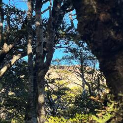 Efter haglvejret gik vi videre, og en halv times tid senere gik vi igen i solskin, og vinden havde igen aftaget. Herefter gik det over flere forskellige toppe, inden det gik meget stejlt, mudret og klatrende over væltede træer mod Old Man Hut. De knap 250 højdemeter, som vi gik ned, skulle vi op ad igen næste morgen. Wuhu!