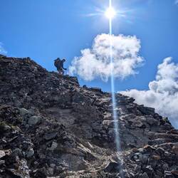 After the hailstorm, we continued on, and about half an hour later we were walking in sunshine again, with the wind having eased. From there, the route crossed several different peaks before dropping very steeply, muddy and with some scrambling over fallen trees—toward Old Man Hut. The nearly 250 metres of elevation we descended would have to be climbed again the next morning. Wuhu!