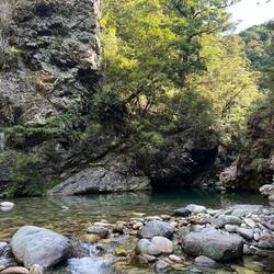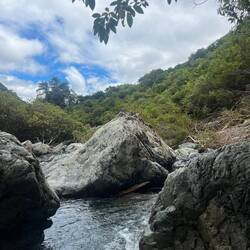 After that, we had a more open and flatter section along the river, which was a welcome change. Here we took a short break and cooled off in the water before starting a 500-meter climb that felt almost vertical. After just over two hours, I finally reached the top, where Svea was waiting for me, as we planned to descend together. The descent was described as partly very steep something we had experienced many times before, but this time the description did not match the first 100 meters at all, as it had nothing to do with hiking and was more like free climbing!