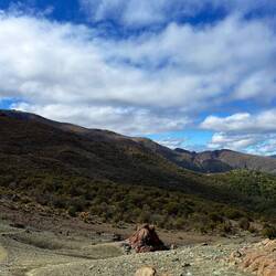 The morning started off very cold and windy, so gloves were brought out for the first time. Off we went toward beautiful views and mountain peaks. After a short break, dark clouds started moving closer and closer. At first, we saw them drift away, but shortly after they came rushing toward us, and what we initially thought was rain turned out to be hail. We sought a bit of shelter among the few trees that were around.