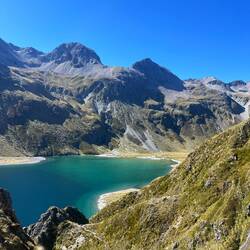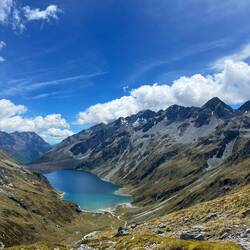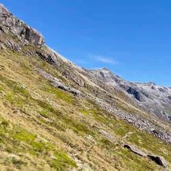 We were the last to leave Blue Lake, which meant we had the rest of the day completely to ourselves, making it a very special experience. Today we were heading up the second-highest mountain of the trip, Waiau Pass (1,861 m). Before that, however, the trail first climbed toward Lake Constance, which already offered stunning views. We walked a short section above the lake with views down to it, before descending steeply and slowly.