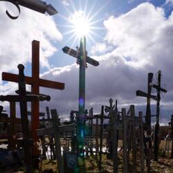 Unsere Aufgabe ist es, ein handgefertigtes Kreuz für unser Team zu fertigen und auf dem Hügel aufzustellen. Es sind mehr als 100.000 Kreuze hier. Ein mysteriöser und etwas unheimlicher Ort.
