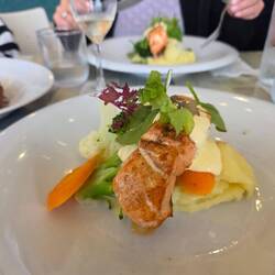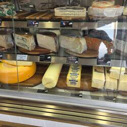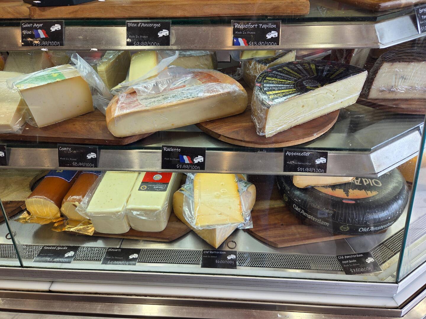 Leberkäs gegessen. Ein Käse / Fleisch Laden. Dort gibt es französischen, holländischen und schweizer Käse