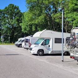Gegenüber auf dem Parkplatz sind auch noch ausgewiesene Womoplätze inklusive Stromsäulen.