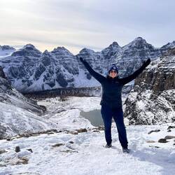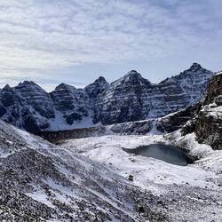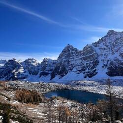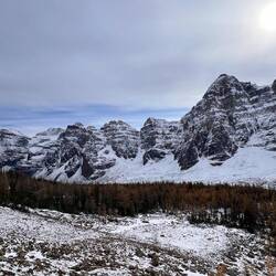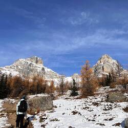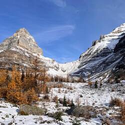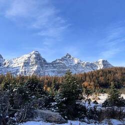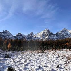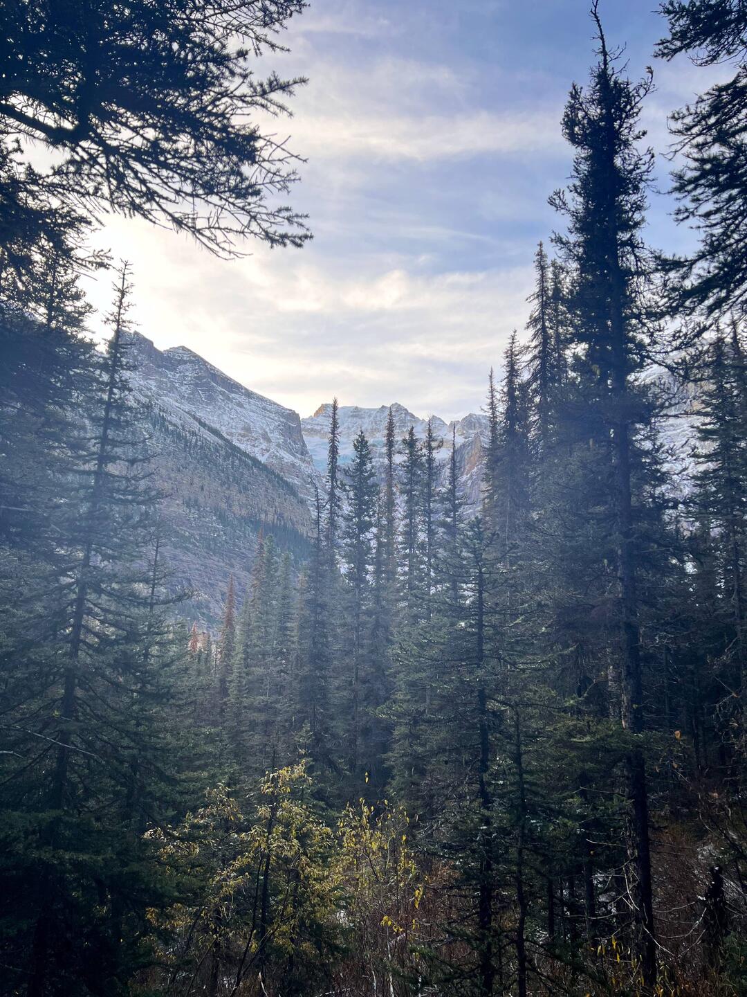 We started at 8:30am and headed towards Sentinel Pass. The start of the trail walked through a forest and contained a lot of switchbacks as we zigzagged our way to the top. As we exited the forest we put on our cleats as it was quite icy on the track. We walked towards Larch Valley and we could see the Larch trees that were a beautiful golden colour.