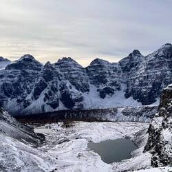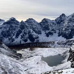 We found a spot for breakfast off the track and quickly ate as it was still freezing. We walked past two lakes and could see the next switchbacks up ahead that we had to walk up in the snow. We continued onwards and started the climb to the top of sentinel pass. We definitely were very happy we had our ice cleats as due to how cold it was it was very icy in sections. We made it to the top and the views were beautiful looking at the mountains surrounding us.