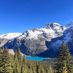 We walked to the end of the trail with a wonderful view of the valley, and glaciers at the top of the peaks. We had our lunch, before continuing back along the trail towards Lake Moraine. As we walked towards Lake Moraine we got a glimpse of the lake and it was a beautiful Emerald colour.