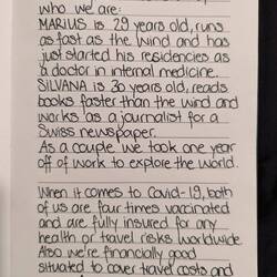 abgehauenBrief der letzten Chance December 12, 2022 in the United States ⋅ 🌙 -1 °C TravelerGrüsse aus Limburg. Seid Ihr schon in Washington ??12/13/22ReplyTravelernoch nicht! Aber morgen fahren wir los. Liebe Grüsse zurück!12/13/22ReplyTravelerToll geschrieben! Also, ich würde Euch sofort mitnehmen, leider verkehrt meine Nussschale nur zwischen Zug und Cham 🤣 Kommt gut, ich bin sicher, mit Eurem CV wird mancher Frachter sogar einen Zwischenstopp machen 👍12/14/22ReplyTravelerGood luck hoffe es klappt. Sind aktuell uns an den Winter zu gewöhnen Hanspeter und Pia12/16/22Reply4 likes Trip