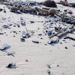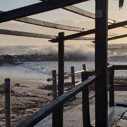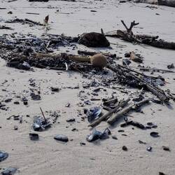 Mittagshalt nach dem Marktbesuch. Die Strände sehen im Moment alle so aus: Schwemmholz und Plastikmüll