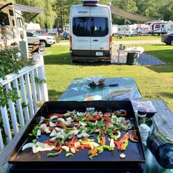 I always joke that if you let me visit I will bring my bedroom and the steak tips! Some of my very best camping experiences this past year have taken place in a driveway with spectacular views including lake and beach front, mountains and some great sunrises. I am blessed with some very loving friends and family. It doesn’t get better. Friends, family, cheese and crackers, wine and a view. There is a sign in the van that says “welcome to my vacation home!” Although sometimes it’s your vacation home and I’m just borrowing a parking space in paradise. Thank you!