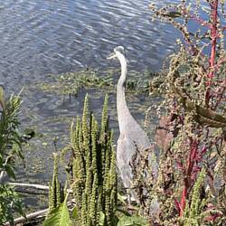 The garden visiting Crane is real although he looks like a statue. He’s huge. Thanks to cousin Suzie for catching this one in the back yard next to the fish pond. I think he was looking for a snack.