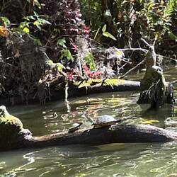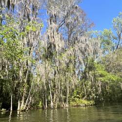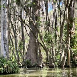 The boats were two seater speed boats that jumped waves with ease but could also slow to a crawl when in the narrow canal. I read that the movie “The African Queen” was filmed in the canal. I’m sure you will recognize it. The water was like glass. There were 1,500 year old cypress trees draped with moss, and sprouting cypress knees to help the trees breath. To add to this unique scenery were birds, turtles, alligators and snakes. It’s crazy busy on the lake and so peaceful in parts of the canal.