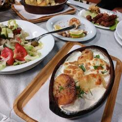 Wir haben uns für einen CP entschieden, weil wir hier wieder Schatten brauchen. Doch einigermaßen erschöpft kommen wir nach der kurzen (ca 70 km) aber endlosen Fahrt an. Nach einer Rast spazieren wir noch ein wenig Richtung Stadt und speisen in einem Megagrillrestaurant. Da gibt es sehr interSachen: Käse vom Pferd, Rinderhirn, Zunge, Innereien, Ziege, Schaf, Rind, Schafskopf usw. Ich esse hervorragende Kartoffel gratiniert und einen riesen Salat. Franzis Portion Cevapcici sind 10!!! riesen Teile. So oarg!Leer más