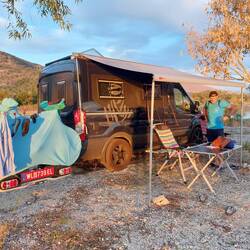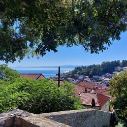 Der Stellplarz ist wunderschön, direkt am Meer, mit Dusche und Wasserhahn. 2 Restaurants, Kaffee in der Nähe. Ein paar WoMos stehen schon da und kaum sind wir gelandet, wollen die ersten, ein Paar aus Ried 😅😅😅, eine Führung durch unseren Vadrouille. Sie fahren mit einem T5 und mussten in Montenegro viel Regen aushalten. Viel wird gefachsimpelt und ausgetauscht. Nach einem kurzen Bad im bacherlwarmen Wasser gehen wir gemeinsam mit den Riedern essen.