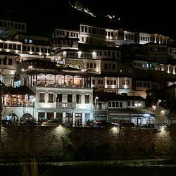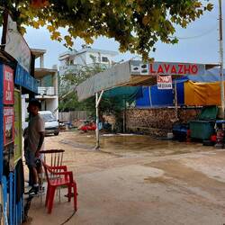 Auf einer Bergstraße, eng und kurvig schlängeln wir uns über einen Pass, der uns nach Gjirokastra bringen wird. Verlassene Tankstellen, Bars, Gasthäuser ... Ziegen- und Schafherden. Durch ein weites Tal geht es auf einer ausgebauten Straße nach Gjirokastra. Die Verkehrsregelung ist recht interessant. 50 auf völlig geraden, breiten Straßen, wenns hoch her geht ein paar Meter 80, es kann aber auch 60 sein.