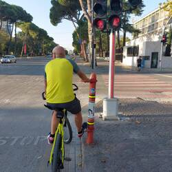 Diese Strada Statiale ist wirklich langweilig. Ein hässliches Dorf reiht sich ans nächste. Eine KMB nach dem anderen verschandelt die Gegend. Trostlos, grau, uninteressant endet es in Mestre bzw Mestre Vorstädte wo viele Menschen auf Busse warten, plattenbauartige Wohnsilos stehen, komische Einkaufsläden aufgereiht warten. Lange gings entlang des Flughafengeländes, Marco Polo, ein Riesending , dann gleich die Werften und Häfen. Niemals habe ich diese Seite von Venedig gesehen. Letztlich erreichen wir unseren Zielort. Ganz in der Nähe des Fährhafens wohnen die Leute wieder ländlich, weg von der Industrie. Wie es hier heißt. Keine Ahnung. 6km zur Fähre stehen wir vor einem Friedhof. Eine köstliche Pizza und guten, für die Gegend typischen, Perlwein gab's zum Abendessen. 100% Einheimische und bummvoll, haben wir die beste Wahl getroffen.