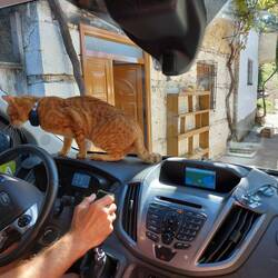 Unser Reisekater bleibt inzwischen im Auto und wie immer, wenn wir weg waren, widerfährt uns intensive Begrüßung.