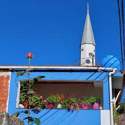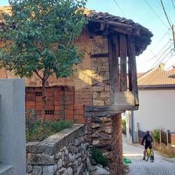 Heute ist Waschtag. Wie gut das ist, alles wieder sauber. Auf diesem Stellplatz kann man die Waschmaschine der Besitzer nutzen. Wir haben zwar genug mit um ohne Waschen auszukommen, aber beide mögen wir viel Schmutzwäsche nicht. Franzi muss ein paar Sachen reparieren, z.B. hat sich die Sat Schüssel nocht mehr aufgestellt. Auch das Trittbrett wurde in der Werkstatt schlecht montiert und ist nicht mehr benutzbar. Auch in einer Werkstatt kann ihm nicht geholfen werden. Es scheint wieder die Sonne, aber heiß ist es hier nicht mehr. Wir sind am Fuß des höchsten Gebirges des Kosovo. Nachmittags radln wir ins Dorf und holen uns ein Guzzi in der Bäckerei und trinken in einer Bar Kaffee. Wir sitzen direkt an der Dorfstraße gegenüber der Moschee. Junik ist Dorf. Nichts passiert. Ich werde viel angestarrt, weil ich einen kurzen Rock anhabe und mit dem Rad fahre. Das tun Frauen hier nicht. Junik hat jedoch eine Besonderheit. Die Kulla. Kulla sind Wehrhäuser, die meist 3 stöckig aus Stein und Kastanienholz gebaut wurden. Eine Großfamilie baute möglicherweise mehrere Häuser in einem Cluster. Diese waren mit einer hohen Mauer umgeben. Unten lebte das Vieh, im 1. Stock war die Feuerstelle, Frauenräume und Schlafräume. Es gab zwischen den Stockwerken innen einen Leiter oder Stiege. Oben war das Herrnzimmer wo Gäste empfangen wurden. Diese waren über eine Außentreppe erreichbar. Oft hatte der obere Stock auch Schießscharten. Grundsätzlich waren diese Wohnformen komplett autark.