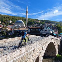 In Prizren steuern wir einen Parkplatz mot Schatten an. Räder herunter und durch einen Park sind wir im Nu mitten in der Stadt. Prizren hat um die 100t EW. Bereits vorgeprägt von Prishtina erwarten wir Ähnliches. Und landen: mitten im Orient. Ein Wahnsinn! Keine Hochhäuser, Kopfsteinpflaster, große, kleine Moscheen, Cafés, Kopftücher. Extremer kann der Unterschied zwischen 2 Städten nicht sein. So was habe ich bisher nur in Nikosia gesehen!