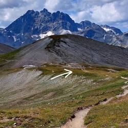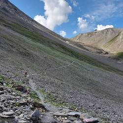 Bivio, ein Traum von Schitourenhängen! Mit dem 1. Gang werden unsere schlafmüden Haxn gleich mega gefordert. Ohne Gnade geht's hinauf, zuerst über Asphalt durch riesige Almflächen. Hektisch warnenMeer informatie