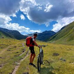 Nach einem kleinen Frühstück in Landeck starten wir bei 19 Grad und radln gleich einmal 600hm am Stück hoch über der Trisanna. Es ist lange kühl und die Berge sind dick eingepackt.